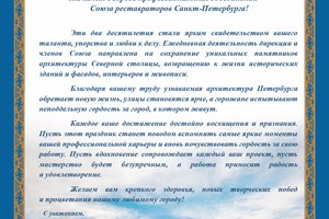 Эти два десятилетия стали ярким свидетельством вашего таланта, упорства и любви к делу. Ежедневная деятельность дирекции и членов Союза направлена на сохранение уникальных памятников архитектуры Северной столицы, возвращению к жизни исторических зданий и фасадов, интерьеров и живописи.