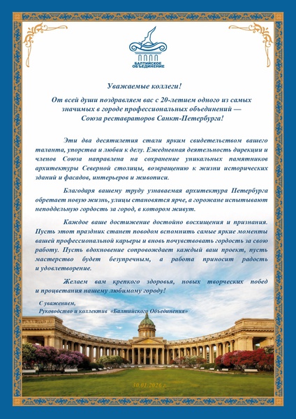 От всей души поздравляем вас с 20-летием одного из самых значимых в городе профессиональных объединений — Союза реставраторов Санкт-Петербурга!